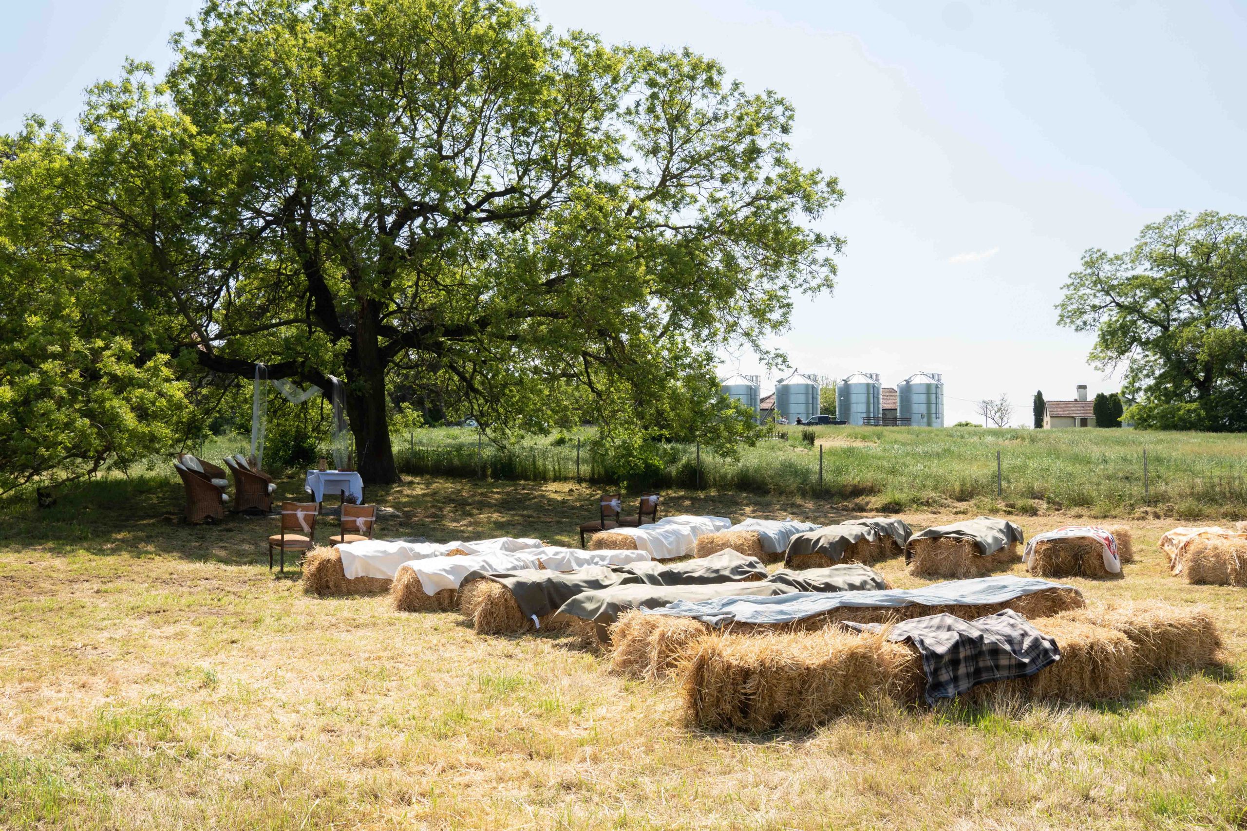 Otthon, a szabad ég alatt Ez a pár úgy döntött, hogy nem bérelnek kastélyt, hanem a saját birtokukon, egy hatalmas sátorban ünneplik meg a nagy napot. Volt ebben valami hihetetlenül bátor és romantikus. A vendégeket nem feszengős székek, hanem szalmabálákra terített puha takarók várták a szertartáson. A háttérzaj nem a város morajlása volt, hanem a szél suhogása a fák között.